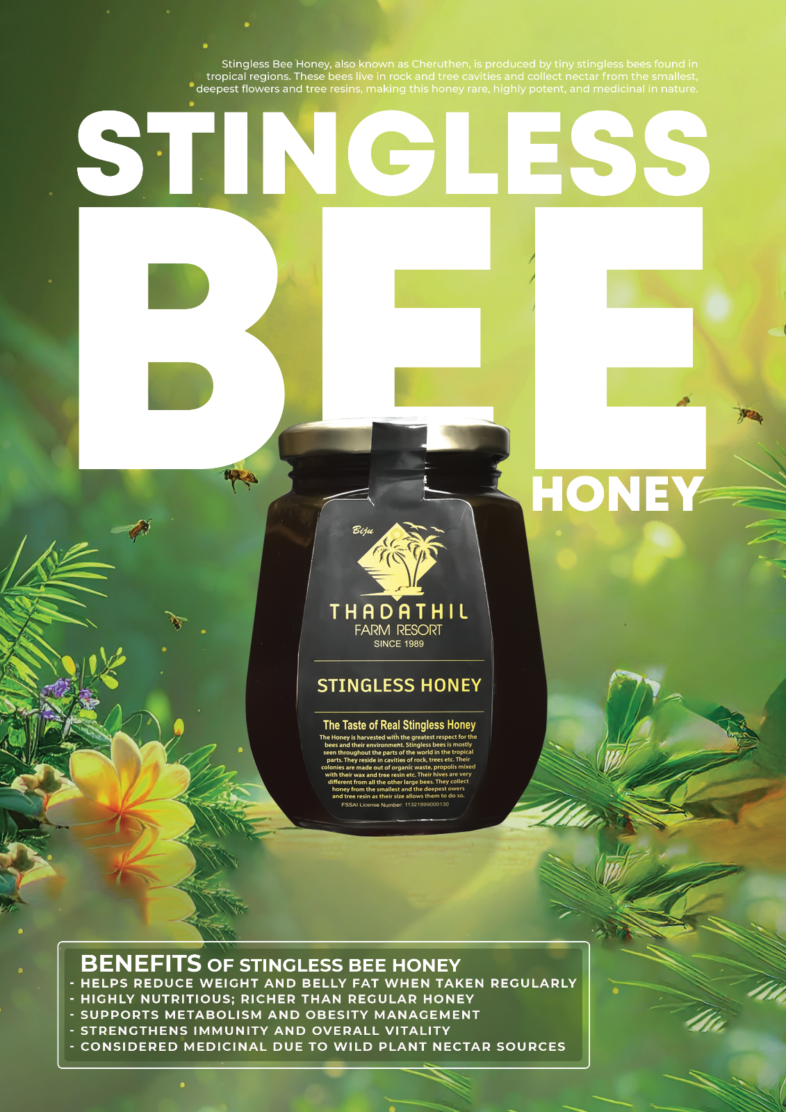 Stingless Bee Honey (Cheruthen) is harvested with the utmost respect for the bees and their natural environment. Most stingless bees are found in tropical regions, where they live in cracks of trees, rocks, and natural cavities.